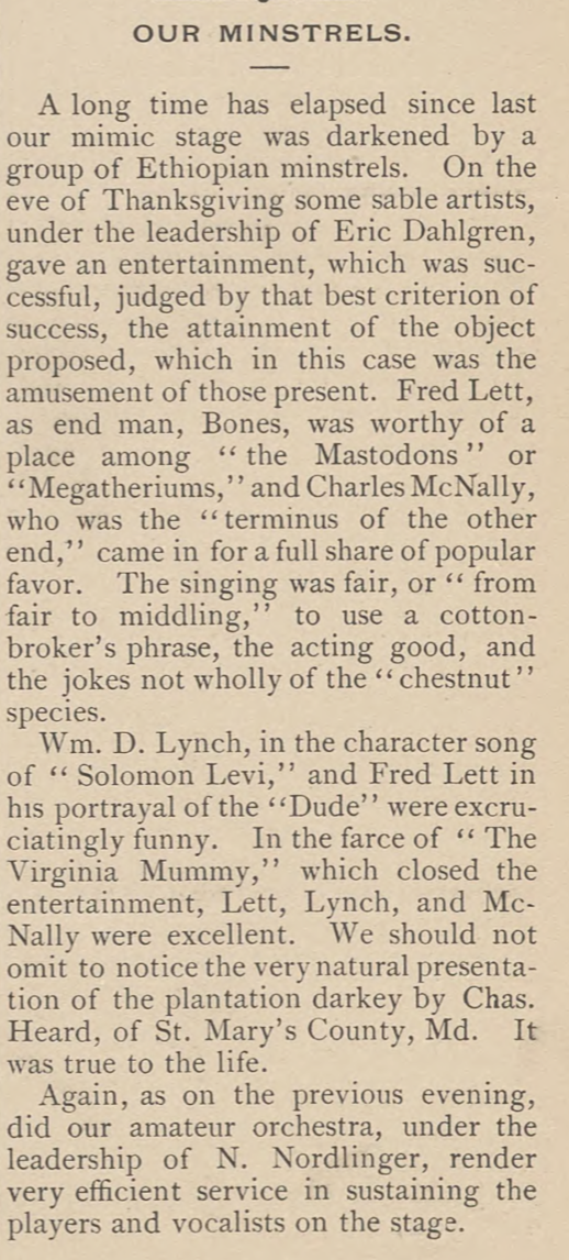 Fred Lett, who was part of the company in 1884, was the end man named “Bones,” while Charles McNally was the other end man, traditionally named “Tambo.” Charles Heard, from St. Mary’s County in Maryland, presented the role of “plantation darkey,” possibly during the third act’s plantation sketch. “It was true to the life,” the Journal said. Most likely it was “true” to these white students’ uninformed idea of plantation life in antebellum America.
