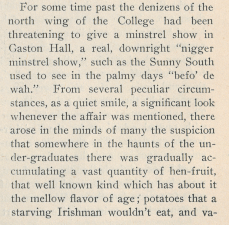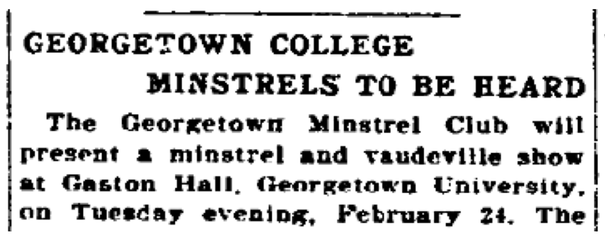 The Georgetown Musical Club, on February 24, 1903, appeared at Gaston Hall in a Mardi Gras minstrel show “for the benefit of the Holy Trinity schoolhouse fund,” to build a new parish hall and schoolhouse. The Georgetown College Journal gleefully described the entertainment as “a real, downright ‘n****r minstrel show,’ such as the Sunny South used to see in the palmy days ‘befo’ de wah.’”
