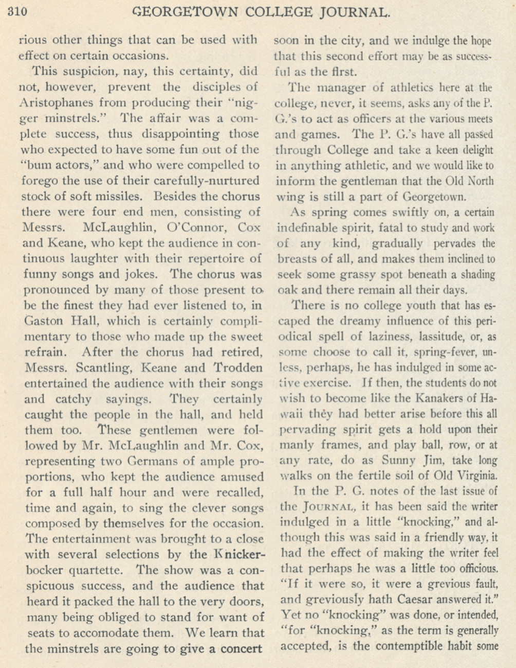Then, of course, Georgetown men staged the May 1910 minstrel show at the Belasco Theater, described above. The Georgetown College Journal offers further that “the production was a creditable one and an additional reason for praising the efforts of the college-bred black-faces is that the idea was a new one to most of the participants and the field of endeavor practically untried.” Seventy years after the birth of blackface minstrelsy, 45 years after the end of the Civil War, a new generation of young Hoyas were being introduced to the racial style of entertainment.