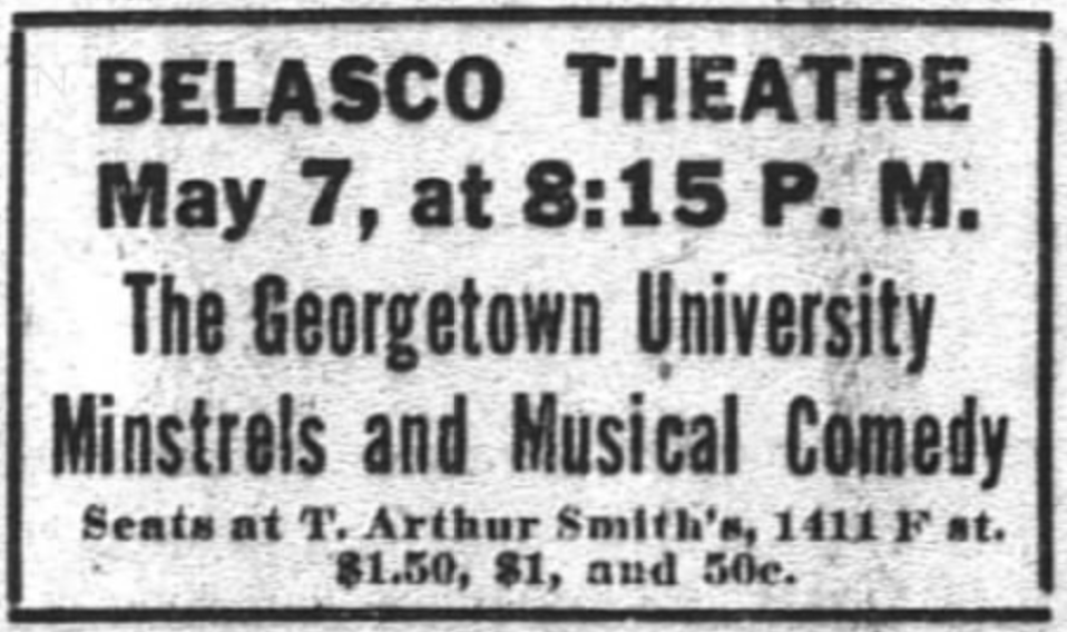 On Sunday, the Herald observed that the applause from the audience—mostly “college men and their friends”—was such that performers had to repeat their lines. The theater was “decorated with the Georgetown colors and Blue and Gray pennants and flags draped the boxes.” And, “probably the part that received the most applause was the minstrel show.”