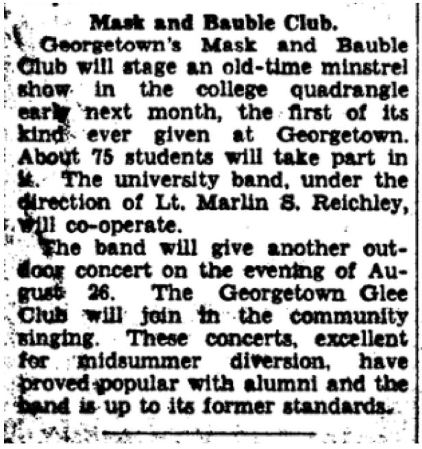 In my journey into the history of blackface minstrelsy at Georgetown and its environs in the nation’s capital—in my reliance on the university’s digital archive for yearbooks and newspapers, and online newspaper databases—I’ve merely brushed a hand across the top of the pond. I look forward to learning more about this history from the research of others who will be able to access and interpret even more sources, to dive fully into the water to discover what lies beneath the surface. But in causing even a small ripple in our community’s past, I hope to illuminate some of the ways that Georgetown participated in this particular form of racist and dehumanizing entertainment.