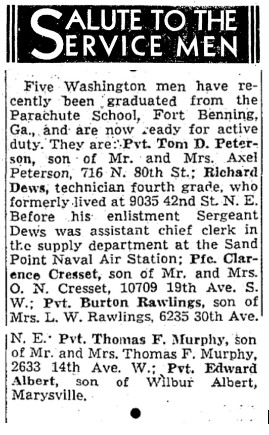 Richard himself enlisted on January 12, 1943. It is not known when he reported for basic training, but the December 16, 1943 edition of the Seattle Daily Times announced that Richard and four other local men had graduated from parachute school at Fort Benning Georgia, “and are now ready for active duty.”