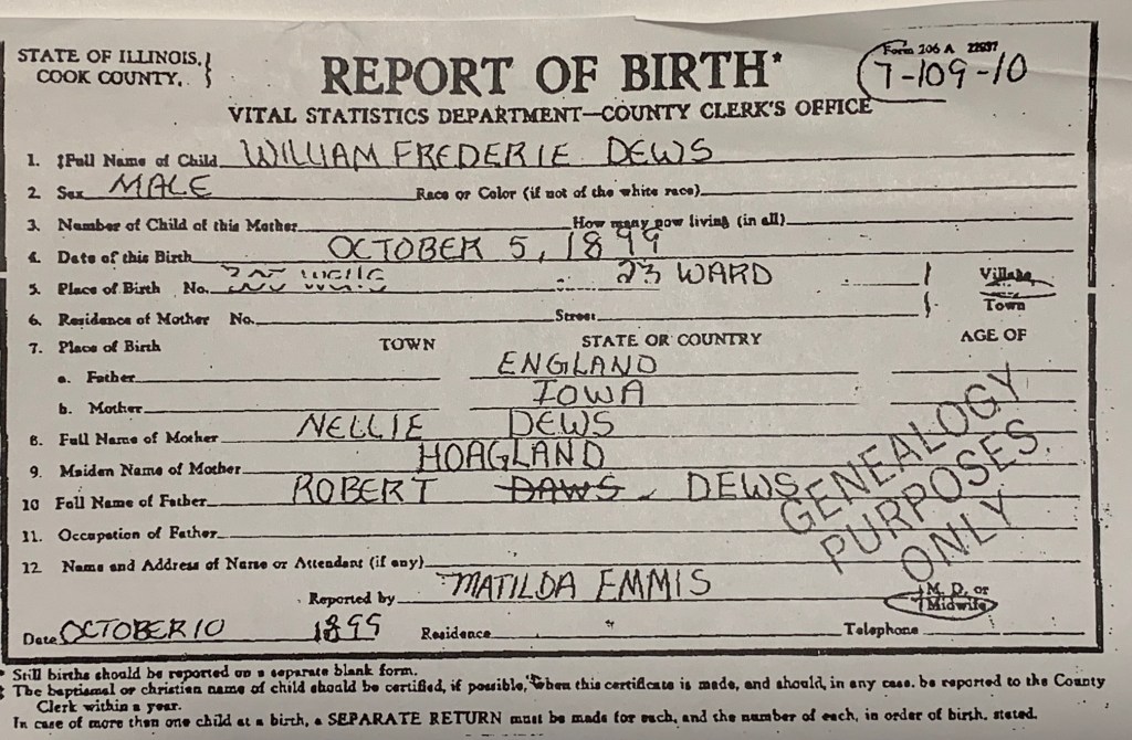 A number of years ago, in 2001 I think, I went to Chicago to visit my aunt and uncle, and while there conducted some genealogy research in the Cook County archives. There, I obtained copies of the birth certificates of all six of the children of my great-grandparents Robert Dews and Nellie Hoagland, including my grandfather, Fred W. Dews. And here I come to two of my favorite genealogical finds in decades of research. First, to my great surprise, his birth certificate listed his name as “William Frederick Dews,” not the other way around. So, based on that I am the THIRD of his name! This information was a great surprise to my father and uncle, too, who had no reason to believe otherwise.