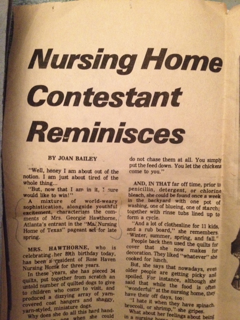 In 1978, when Granny Georgie was 89, she was featured in a local Atlanta, Texas newspaper as that town’s entrant in the “Ms. Nursing Home of Texas” contest.