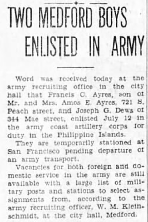 In July 1935, Joseph and another Medford, Oregon man enlisted in the U.S. Army and were assigned to the coast artillery corps in the Philippines. (Medford Mail Tribune, July 18, 1935, p .5.)
